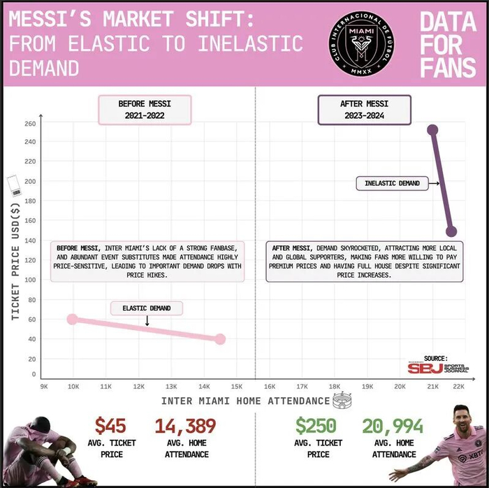 北美足球联赛的动态定价,最经典的是2023年7月梅西加盟迈阿密国际的首秀。这场对阵墨西哥蓝十字的中北美联赛杯比赛,因为梅西的出现,赛前最低票价从29美元(约合210元人民币)飙升到325美元(2340元),激增11.2倍!之后为平息球迷对票价火箭式上升的不满,迈阿密国际主场对奥兰多城的最低票价回落到105美元(710元),但比赛开始前又涨到160美元(1150元),不过,比赛因雷暴天气被推迟1.5小时,最低票价又降到73美元(520元)。